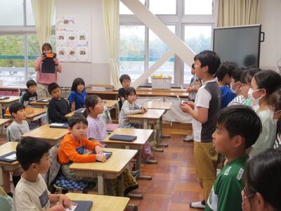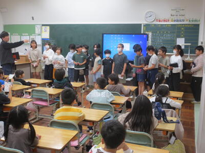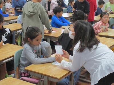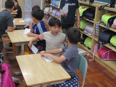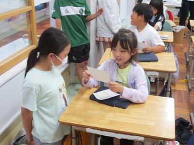 今日の5時間目に、ペア学年になる2年生と5年生が、顔合わせをしました。5年生が2年生の教室に行き、自己紹介をしながら上手に書かれた名刺を渡しました。2年生も自分で書いた名刺を5年生のお兄さん、お姉さんに渡しました。