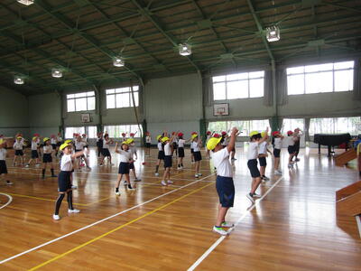 2組はラジオ体操の練習です。お友だちにぶつからないように広がって、電子黒板の動画を参考にしながらラジオ体操第一を覚えました。