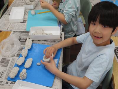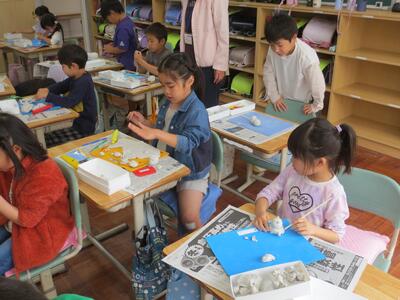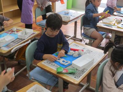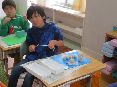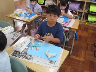2時間目の図工の時間に、2年生が粘土ですきなものをつくっていました。おいしそうなお寿司やおだんご、本物そっくりのイルカなど、みんなとっても上手です!