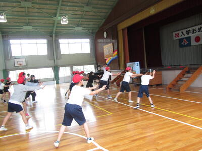 今日は朝から雨模様です。1年生が教室で体育の学習をしていました。体育といっても跳ねたり走ったりするのではありません。