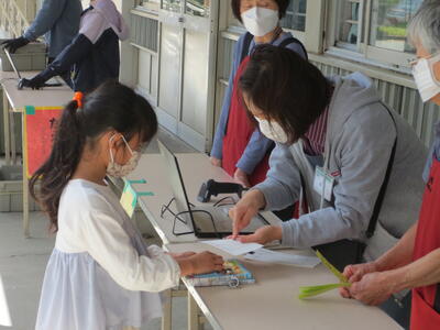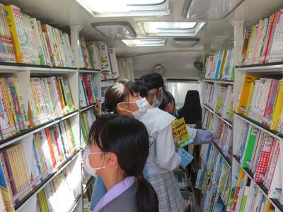 昼休みに、移動図書館ジンタ号が来ました。今年度1回目のジンタ号です。今回は2年生が遠足に出かけていたり、1年生のカ-ドがまだできていなかたりということもあって人数はやや少なめでしたが、借りに来た子はじっくりと本を選んでいました。