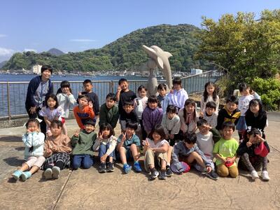 遠足ということで、子どもたちは朝からわくわくどきどきしている様子でした。バスの中では、先生からの魚クイズやバスから見える綺麗な海を楽しみました。