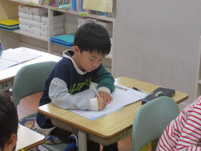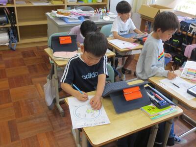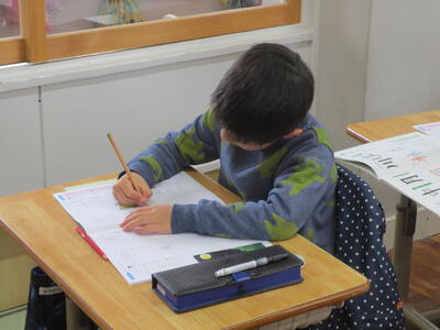 18日(木)の学習の様子です。2年生になって初めての書写の時間でした。お手本をよく見て、一字一字ていねいにノートに書いています。真剣な表情がいいですね!