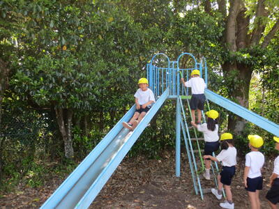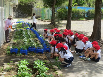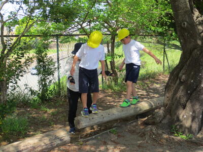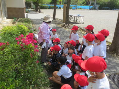 1年生が運動場に出てきました。運動場にはどんなものがあるのか、先生といっしょに見ていました。きれいな花が咲く花壇や楽しそうな遊具など、わくわくするようなものがたくさん!みんなきれいな花をながめたり、すべり台やジャングルジムで遊んだりと、運動場を満喫していました。