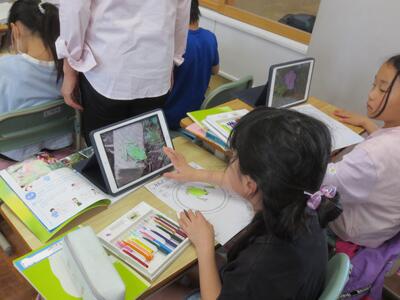 3年生が理科の学習でいろいろな「春」を見つけました。学校で見つけた花や生き物などの「春」をタブレットで撮影し、写真を見ながらカードに記入していました。どの子もとっても絵が上手でびっくりしました。