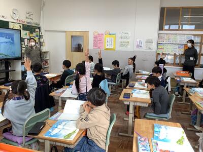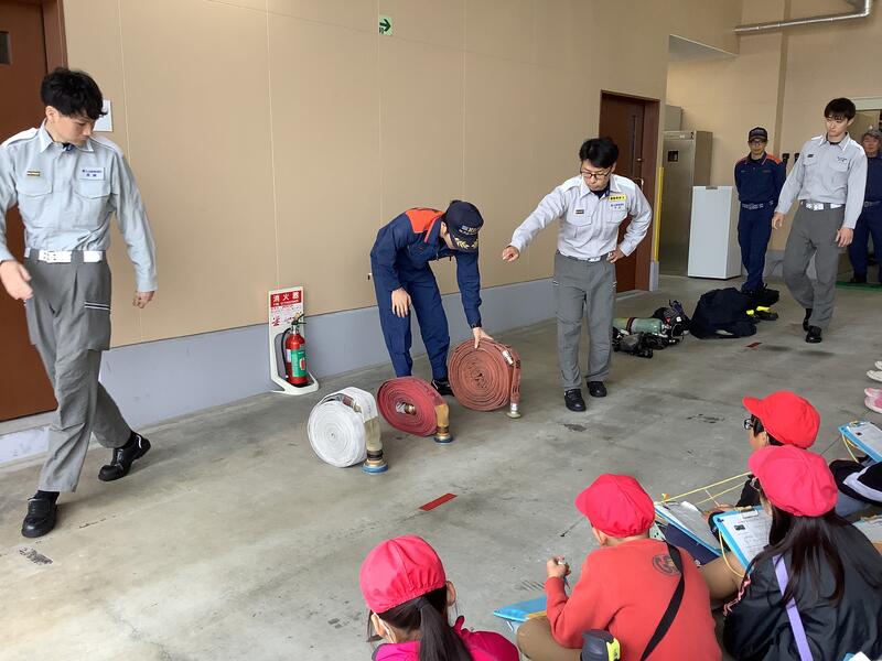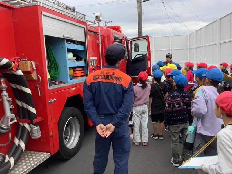 社会科「火事からくらしを守る」の学習に伴い、学区内にある「富士山南東消防本部 中郷分署」へ見学に行きました。施設の中や緊急車両の見学だけでなく、職員さんの働き方をたくさん教えてもらいました。子どもたちは、実際に消防車や救急車、防火服の早着がえなどを見せていただき、急いで現場に駆けつける工夫などを学びました。