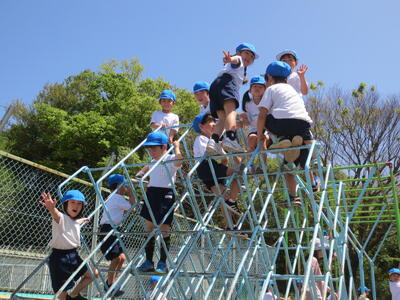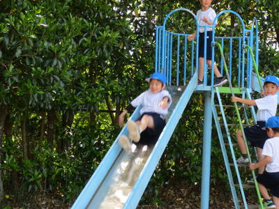 1年生が運動場に出てきました。運動場にはどんなものがあるのか、先生といっしょに見ていました。きれいな花が咲く花壇や楽しそうな遊具など、わくわくするようなものがたくさん!みんなきれいな花をながめたり、すべり台やジャングルジムで遊んだりと、運動場を満喫していました。