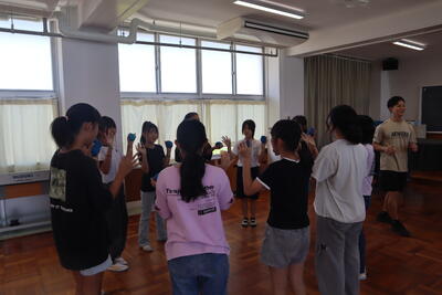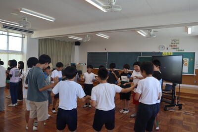6年生の授業では、ボールの手渡しの活動をしていました。最初は2人で、4人、8人、グループ、クラスを二つのグループに分けて、最後はクラス全員で。ボールの手渡しを通して、周辺視野による認知と動作を連動させます。人数が増えると、なかなか難しいようです。楽しみながら、活動する子供たち、笑顔があふれます。