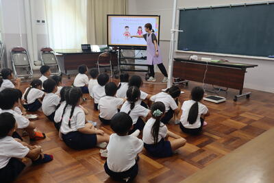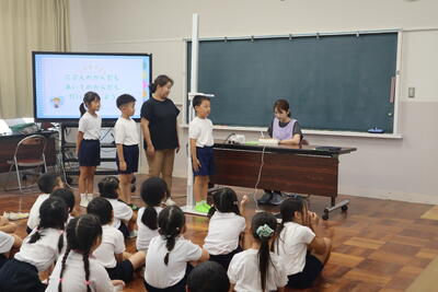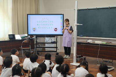 夏休み明け、各学年、学級ごとに発育測定を行っています。今日は1年生が、発育測定と保健指導を行いました。プライベートゾーンのお話、自分のからだ、友達のからだを大切にすること、しっかりとお話を聞いてくれた1年生です。保健室の先生のお話を聞いた後、体重と身長を測りました。みんな、大きくなりましたね。