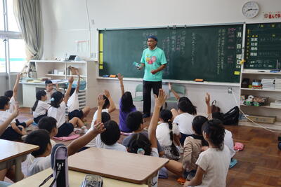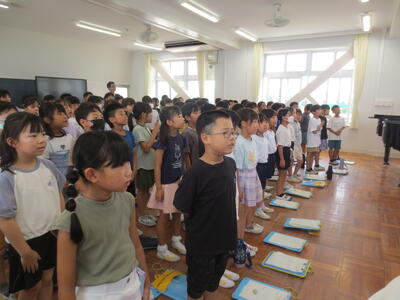 3年生は、総合的な学習の時間で、向山小50年の歴史について考える活動を進めています。夏休み前には、卒業生のみなさんをお招きし、当時の向山小について、お話をうかがいました。9日の3時間目には、かつて向山小でお仕事をしていらっしゃった先生方に、その当時の学校の様子をお話していただきました。開校当時の校舎内、教室、運動場、子供たちのようすを聞いて、驚くことも多かったようです。向山っ子の歌についても詳しくお話していただきました。会の最初には、子供たちの歌声が音楽室内に広がり、あたたかな空気に包まれました。司会とあいさつもしっかりできて、立派な3年生です。お話をしてくださった先生方、本当にありがとうございました。