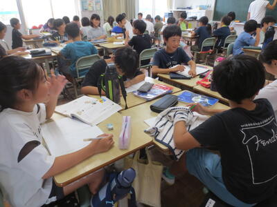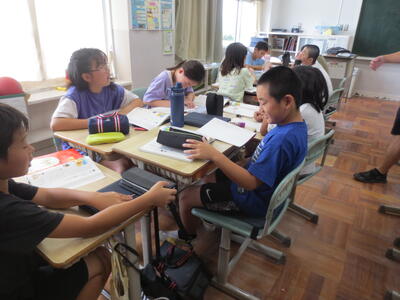 5年生の国語の授業では、討論会を行う学習活動で行っていました。子供たちが、身近な話題から、自分の意見を持ち、根拠をもって、討論を進めていきます。今日の授業では、自分の意見をノートに書き、複数の理由を記述する活動に、生き生きと取り組んでいました。