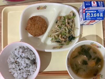 <献立名>梅麦ご飯・かつおコロッケ・ごま酢和え・とんじゃが味噌汁・牛乳