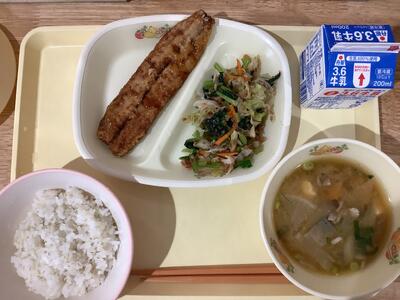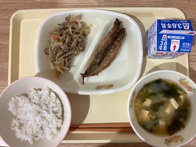 <献立名>麦ご飯・ししゃもの竜田揚げ・切り干し大根と豚肉の炒め物・みそ汁・牛乳