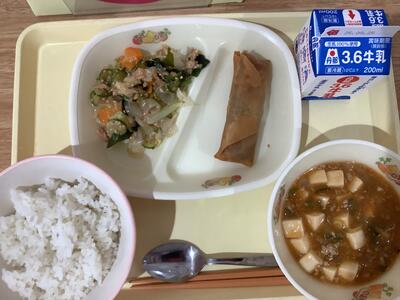 <献立名>麦ご飯・トマーボー・春巻き・こんにゃくサラダ・牛乳