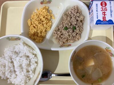 <献立名>麦ご飯・二色丼の具(炒り卵)・(肉そぼろ)・具沢山汁・牛乳