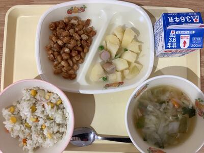 <献立名>コーンピラフ・お好み豆・ジャーマンポテト・野菜スープ・牛乳