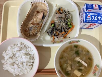 <献立名>麦ご飯・鮭の味噌マヨネーズ焼き・ひじきサラダ・味噌汁・牛乳