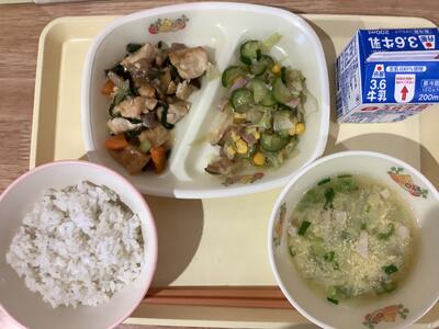 <献立名>麦ご飯・トンクドウフ・中華サラダ・卵スープ・牛乳