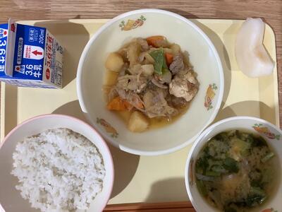 <献立名>麦ご飯・肉じゃが・味噌汁・なし・牛乳