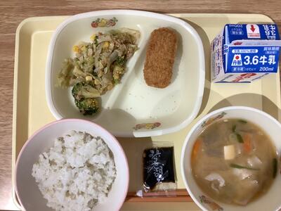 <献立名>麦ご飯・三島薩摩芋コロッケ・ブロッコリーサラダ・呉汁・のりの佃煮・牛乳