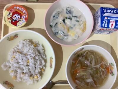 <献立名>コーン入りバターライス・チキンドリア・野菜スープ・アセロラゼリー・牛乳