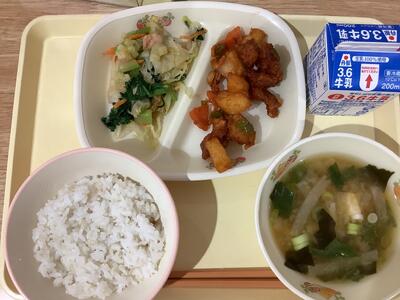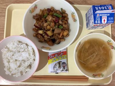 <献立名>麦ご飯・鶏肉と薩摩芋の揚げ煮・もやしと豆腐の味噌汁・アーモンドフィシュ・牛乳
