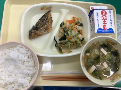 <献立名>麦ご飯・鯖の香味焼き・煮浸し・味噌汁・牛乳