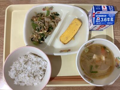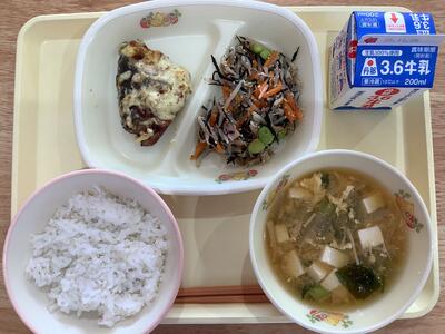 <献立名>麦ご飯・とりそぼろ入り卵焼き・おかかチーズあえ・味噌けんちん汁・牛乳