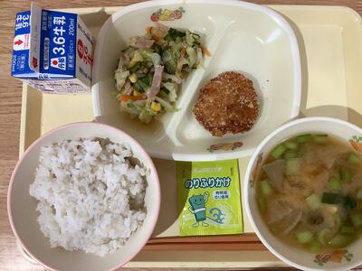 <献立名>麦ご飯・ポテトとお米のささみカツ・野菜のドレッシング和え・具沢山みそ汁・のりふりかけ・牛乳