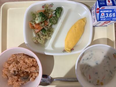 <献立名>チキンライス・ふんわりオムレツ・ブロッコリーサラダ・コーンクリームスープ・牛乳