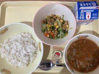 <献立名>麦ご飯・ごぼう入りハッシュドポーク・ビーンズサラダ・ラムネ型チーズ・牛乳