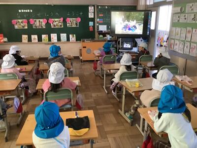 その後、現1年生が下校した後の教室に入り、椅子に座って、お話を聞いたり、映像を見たりしました。