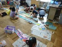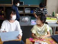1年生授業の様子です。のりと紙を使って作品制作中。上手に貼り付けできたかな?
