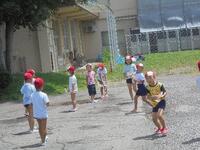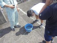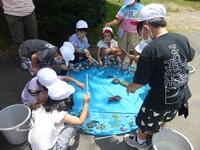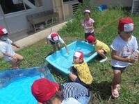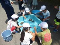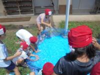 7月20日(水)3校時。5年生が着衣泳をしているプールの近くで、1年生が生活科の「みずあそび」をしています。ペットボトルやマヨネーズ、ケチャップの容器などを使って汲んだ水を飛ばします。さあ、誰のが一番遠くまで飛ぶかな?