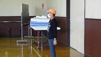 2年生体育の授業の様子です。マット運動をしているところです。準備体操を入念に行っているところです。