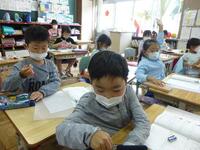 1年生国語の授業です。ひらがなの勉強中です。「ふ」を練習していました。なかなかバランスをとるのが難しい文字です。4つの部屋を意識して、ていねいに書き取りしています。