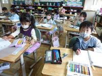 夏休み前の~授業の様子です。1年生外国語活動の授業です。おえかき、色塗りをしながら動物の名前や色の名前にふれていきます。