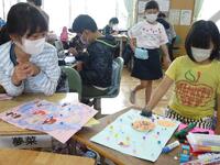 2年生図工の授業です。作品の振り返りを行っています。力強いタッチの作品がいっぱいです!