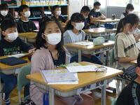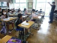 6月28日(火)、2・3校時。3年生でゲストティーチャーに学校歯科医の先生をお迎えして、健口教室を開催していただきました。感染症対策のため、実技指導が困難な中、テスターで調べた磨き残しの写真や、絵図を使って、子どもたちにわかりやすくご指導くださいました。子どもたちからは、「あ~!」という納得の声や、「わ~!」という驚きの声が湧き上がり、心に響いている姿が見受けられます。いただいた歯ブラシで早速歯磨きのポーズ!きっと今日からの歯磨きに学んだことを生かしてくれることと思います。