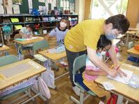 1年生国語の授業です。ひらがなの勉強中です。「の」を練習していました。こちらも1年生にとってはバランスをとるのが難しい文字です。4つの部屋を意識して、ていねいに書き取りしています。