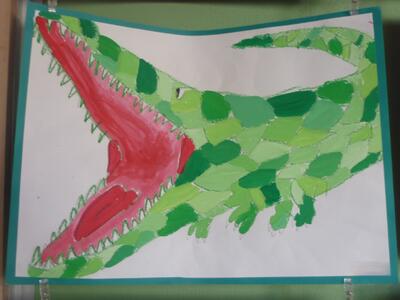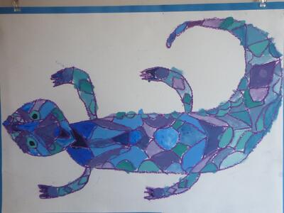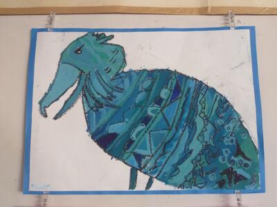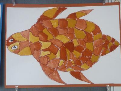 2年生の廊下には、図画工作科で取り組んだ絵が掲示されています。個別面談でも、保護者の方々に見ていただいていますが、グラデーションが素敵な作品です。