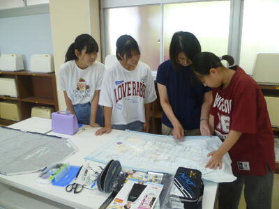 今日から、エプロン作りがスタートしました。まず、三つ折りにしてまち針をさしていきました。