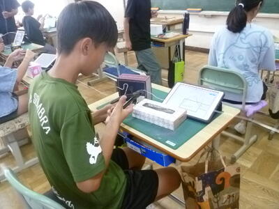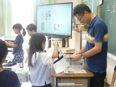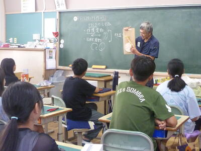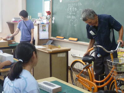 クランク運動を利用したおもちゃ作りに取り組みました。おもちゃ作りといえば、校内の用務員さんです。長伏小のみんながよく遊んでいる校長室前のがちゃぽんも手作りで作ってくれました。用務員さんにクランク運動について詳しく説明をしてもらい(自作の教材で)、子供達は「あ~!なるほど」とつぶやいていました。身近なクランク運動には、自転車があることも分かりました。