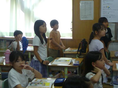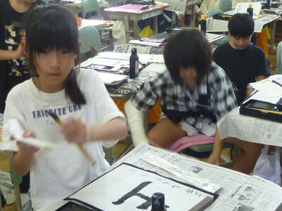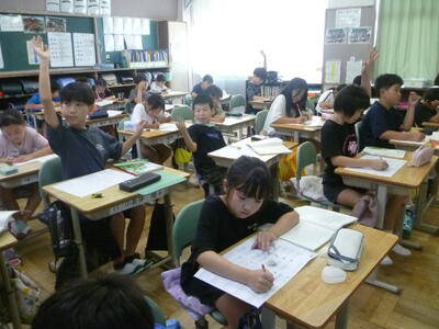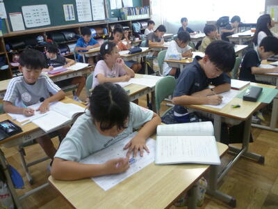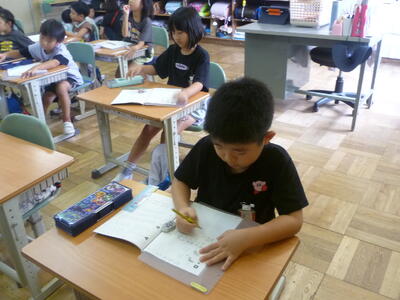 3校時、3年1組は書写の学習で「土」という文字を練習しました。徐々に準備や片付けが手際よくなっているなという印象を受けました。「とめ」も意識して取り組んでいました。