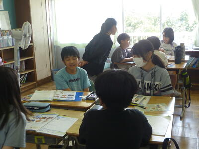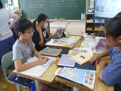 外国語科では、行ってみたい国を決めて、国の名前とその理由を英語を使って説明する学習をしました。子ども達は、教科書の例を真似しながら、英語を使って表現していました。