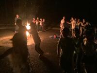 火の神から「健康の火」「友情の火」「感謝の火」「平和の火」を授けてもらった火の子たち。みんなでダンスを踊り、クイズやゲームで楽しみました。雨の予報があったため、早めの切り上げとなりましたが、子供たちの笑顔が炎に照らされていました。