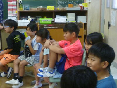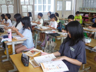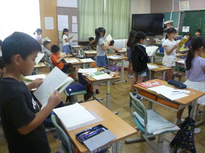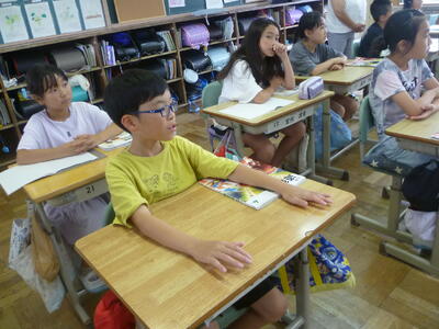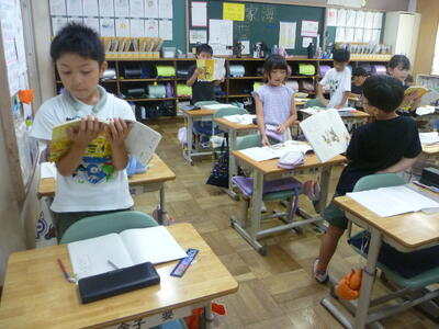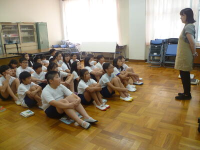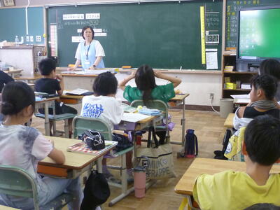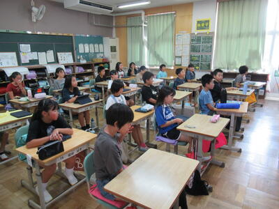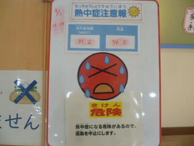 今日は、朝9時から気温が30℃を超えました。2時間目と3時間目の間の15分休みの時点で熱中症指数が31℃の「危険」に至ったため、屋外での活動は全校一斉に見合わせました。昼休みも同様でした。子供たちは、教室で自由に過ごしましたが、やはり暑かったです。