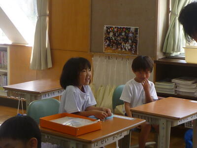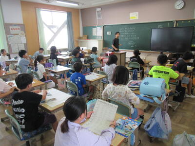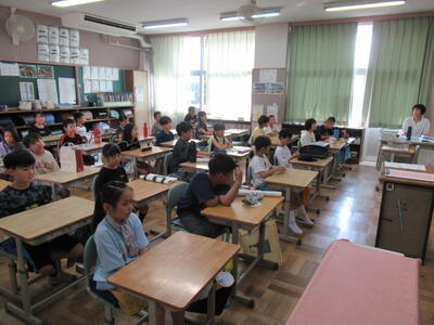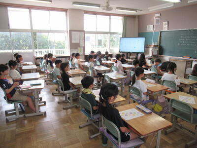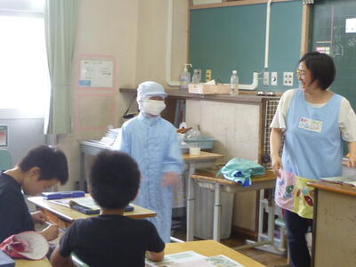 「いただきます ごちそうさま」の学習では、本校の栄養士が授業を行いました。普段から衛生面に気を付けて給食を作っていることや、子供達に美味しく給食を食べてもらう工夫を話しました。衛生面の話のなかで、いつも着ている服を紹介し、髪の毛やごみが入らないようにしていることを取り上げると、「暑そう…」「たいへん…」など子供達のつぶやきが聞こえてきました。命をいただく感謝と同時に、作っていただいていることへの感謝も大切ですね。