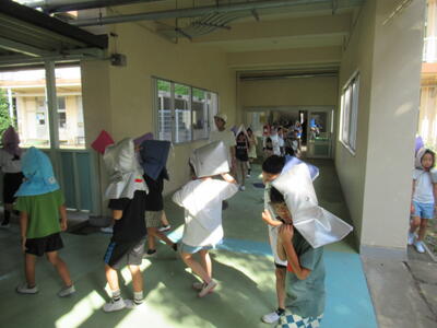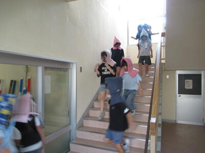 大きな揺れを想定し、まずは一時避難。机の下に身を隠しました。特に頭の保護は大切です。揺れがおさまったら、防災頭巾を被り、二次避難をしました。運動場の南側に全校児童が集合しました。