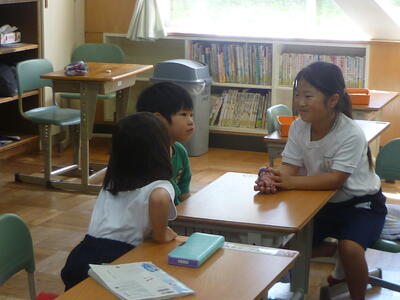 朝の時間は、長伏っ子タイムでした。今日のテーマは、「共感すること」です。1・2年生の教室を見ると、友達同士のやりとりの中で、よく見かけるシーンを役割演技で再現していました。例えば次のような何気ない会話で、どのように言葉を返したら、相手も自分も気持ちよい関係でいられるかを考えました。
